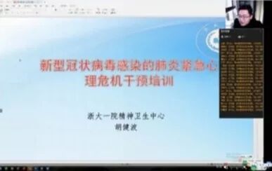 2020年2月8日,接到杭州市残疾人联合会的邀请,由于一线工作人员可能存在密切接触导致工作人员恐慌焦虑的情况,我科副主任技师胡健波老师通过钉钉直播为残联系统的工作人员做了一场疫情下的心理调适公开课,缓解了一线工作人员的紧张情绪。同一天,胡老师通过ZOOM远程直播为下城卫健局管理的15名隔离人员进行了心理疏导。